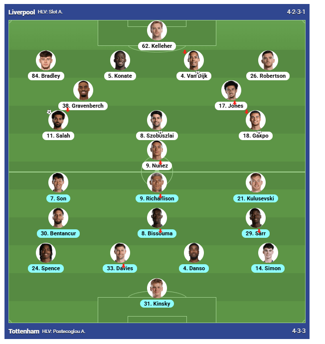 Không dừng lại ở đó, Liverpool tiếp tục khiến Tottenham choáng váng với những pha tấn công sắc bén. Phút 75, Dominik Szoboszlai tung cú dứt điểm hiểm hóc từ ngoài vòng cấm, nâng tỷ số lên 3-0. Chỉ 5 phút sau, Virgil Van Dijk hoàn tất cơn ác mộng của Spurs bằng cú đánh đầu chính xác từ pha đá phạt góc của Alexis Mac Allister, ấn định chiến thắng đậm 4-0.