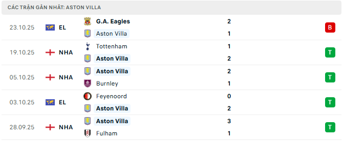 Phong độ Aston Villa 5 trận gần đây