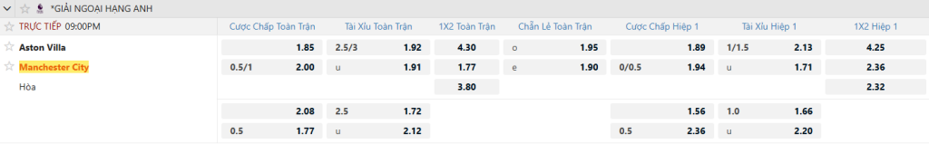 Cả hai đội đều có xu hướng chơi tấn công, sở hữu hàng công chất lượng nhưng hàng thủ chưa thực sự kín kẽ. Với phong độ ghi bàn cao của cả Aston Villa lẫn Man City, trận đấu tại Villa Park hứa hẹn sẽ diễn ra sôi nổi, nhiều cơ hội và có khả năng vượt mốc bàn thắng. Kèo Tài Xỉu 2.75 được đánh giá sáng cho cửa Tài.