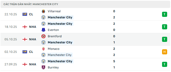 Phong độ Man City 5 trận gần đây