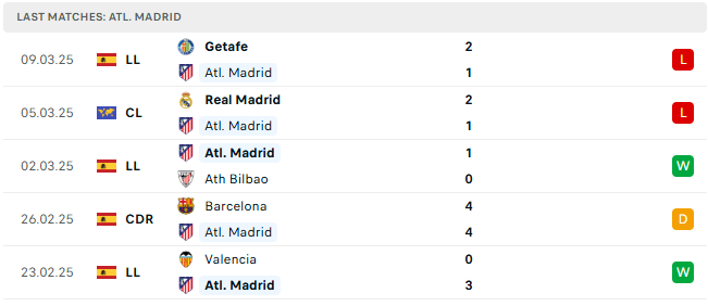 Phong độ Atletico Madrid 5 trận gần đây