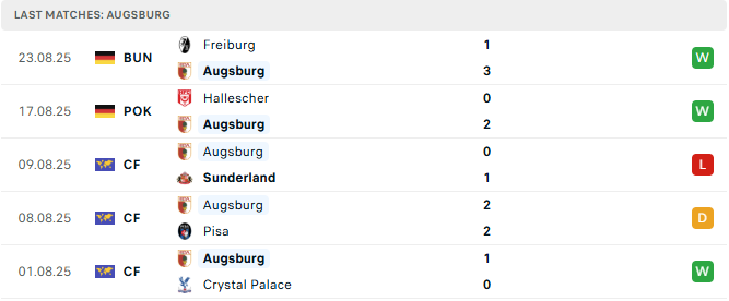 Augsburg bước vào mùa giải mới với sự tự tin lớn sau khi giành chiến thắng 3-1 ngay trên sân Freiburg ở vòng mở màn. Đây là kết quả đầy bất ngờ khi Freiburg vốn được đánh giá cao hơn, nhưng Augsburg đã chơi phản công cực kỳ hiệu quả và tận dụng tốt các cơ hội có được.