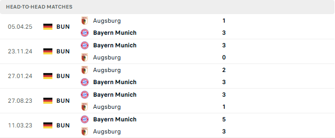 Trong 6 lần gặp nhau gần nhất, Bayern Munich toàn thắng Augsburg, ghi tới 19 bàn và chỉ để thủng lưới 5 lần. Sự chênh lệch về đẳng cấp và chiều sâu đội hình khiến kết quả này không mấy bất ngờ. Tuy nhiên, thống kê cũng chỉ ra rằng, trong 5 lần gần nhất tiếp Bayern trên sân WWK Arena, Augsburg từng 2 lần giành chiến thắng. Đây là điều khiến Bayern không thể chủ quan, bởi WWK Arena thực sự là nơi “Hùm xám” từng sảy chân.