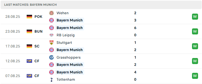 Hiện tại, Bayern đang có phong độ cực cao với 6 chiến thắng liên tiếp, bao gồm cả 3 trận giao hữu đầu mùa, chiến thắng ở vòng mở màn Bundesliga và danh hiệu Siêu cúp Đức. Điều này cho thấy đội bóng xứ Bavaria đã sẵn sàng hướng đến mục tiêu thống trị giải quốc nội thêm một lần nữa.