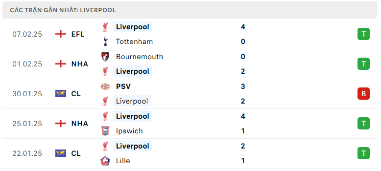 Phong độ Liverpool 5 trận gần đây