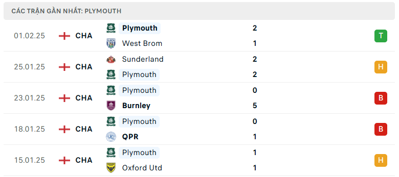 Phong độ Plymouth Argyle 5 trận gần đây