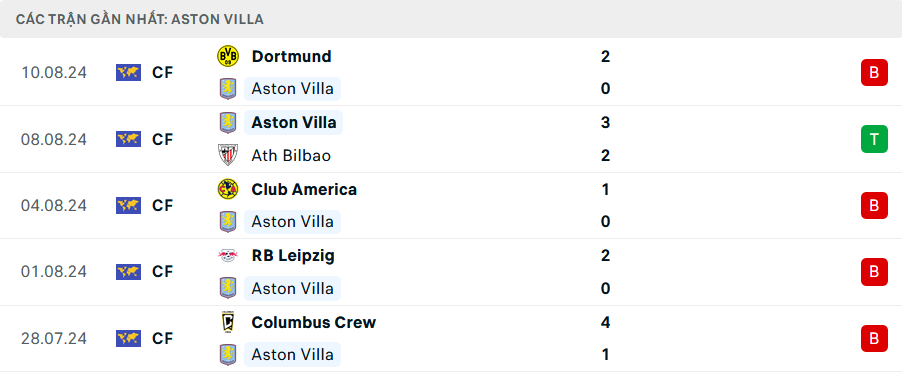 Phong độ Aston Villa gần đây