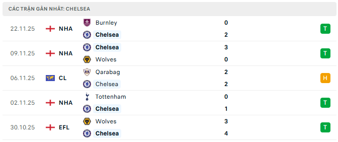 Phong độ Chelsea 5 trận gần đây