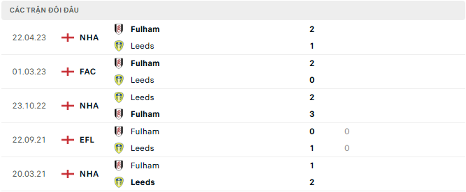 Nhìn vào đối đầu trực tiếp, Fulham chỉ thua 1 trong 5 lần gần nhất tiếp đón Leeds tại Premier League (thắng 3, hòa 1). Thất bại duy nhất ấy diễn ra ở mùa 2020/21 dưới thời Scott Parker. Đặc biệt, 4 lần chạm trán gần nhất giữa hai đội tại giải đấu cao nhất xứ sương mù chứng kiến tới 18 bàn thắng, trung bình 4,5 bàn mỗi trận – một con số cho thấy sự cởi mở trong lối chơi khi họ gặp nhau. Leeds thắng cả hai trận ở mùa 2020/21, nhưng Fulham đã đáp trả mạnh mẽ bằng cú đúp chiến thắng ở mùa 2022/23.
