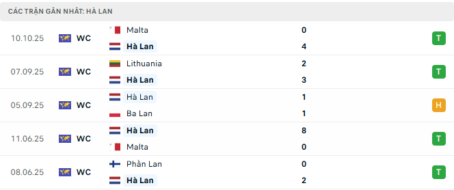 - Hà Lan đang thể hiện phong độ cực kỳ ấn tượng dưới thời HLV Ronald Koeman. Trong 6 trận gần nhất, “Cơn lốc màu da cam” thắng tới 5 trận, ghi 19 bàn và chỉ để lọt lưới 8 lần. Tinh thần của toàn đội đang ở mức cao sau chiến thắng đậm 4-0 trước Malta, nơi hàng công hoạt động hiệu quả với sự tỏa sáng của Cody Gakpo và Memphis Depay. Ngoài ra, sự trở lại của Virgil van Dijk giúp hàng thủ thêm vững chắc, còn tuyến giữa với Frenkie de Jong và Xavi Simons duy trì nhịp pressing và khả năng kiểm soát bóng vượt trội. Được thi đấu trên sân nhà Johan Cruyff Arena, Hà Lan chắc chắn sẽ chủ động dâng cao đội hình và áp đặt thế trận tấn công. Với tinh thần hưng phấn và lực lượng gần như mạnh nhất, thầy trò Koeman hoàn toàn có đủ khả năng thắng cách biệt lớn.