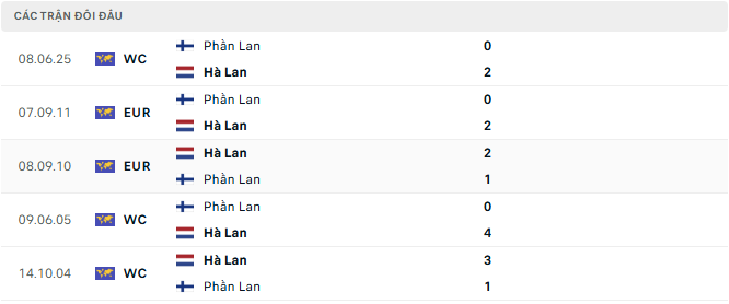 Ở khía cạnh đối đầu, Hà Lan hoàn toàn chiếm ưu thế tuyệt đối. Trong 5 lần gặp nhau gần nhất, “Cơn lốc màu da cam” thắng cả 5, ghi tổng cộng 12 bàn và không để thủng lưới. Sự vượt trội về kỹ thuật, tốc độ và tư duy chiến thuật giúp đội bóng của HLV Ronald Koeman dễ dàng áp đặt lối chơi trước Phần Lan. Dù đối thủ có cố gắng siết chặt khâu phòng ngự, khoảng cách giữa hai nền bóng đá vẫn là quá lớn để họ có thể tạo ra bất ngờ.