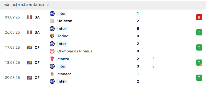 Phong độ Inter 5 trận gần đây