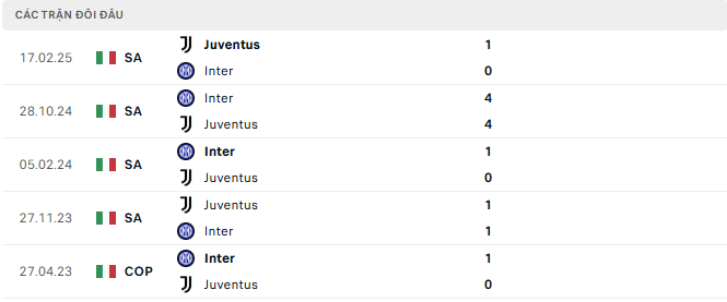 Dù Inter thường có vị trí cao hơn trên bảng xếp hạng những mùa gần đây, thực tế Nerazzurri chỉ thắng 1 trong 6 lần chạm trán Juventus gần nhất tại Serie A. Con số thống kê này chắc chắn sẽ tiếp thêm sự tự tin cho đoàn quân của Tudor.