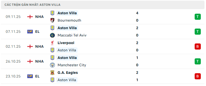 Phong độ Aston Villa 5 trận gần đây