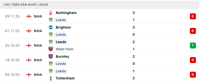 Phong độ Leeds 5 trận gần đây