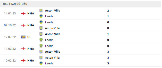 Kể từ năm 2020, hai đội đã gặp nhau 6 lần trong khuôn khổ Premier League và Aston Villa chiếm ưu thế rõ rệt. Họ thắng 3 trận, hòa 2 và chỉ để thua duy nhất 1 trận trước Leeds. Tổng cộng 16 bàn thắng đã được ghi trong những lần đối đầu đó, trong đó Aston Villa ghi được 9 bàn, còn Leeds có 7 bàn. Trận đấu gần nhất giữa hai đội vào tháng 1/2023 khép lại với chiến thắng 2-1 cho Villa, với các pha lập công của Leon Bailey và Emiliano Buendía.