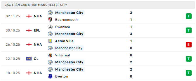 Man City đang cho thấy phong độ ổn định và hiệu quả ở giai đoạn giữa mùa. Sau chiến thắng 3-1 trước Bournemouth tại vòng 10 Ngoại hạng Anh, thầy trò Pep Guardiola đã có 4 chiến thắng trong 5 trận gần nhất trên mọi đấu trường. Lối chơi kiểm soát bóng toàn diện, tấn công đa dạng và khả năng pressing tầm cao tiếp tục là điểm mạnh của đội chủ sân Etihad.