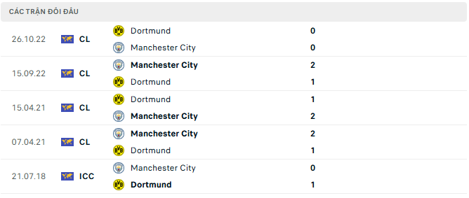 Trong 5 lần đối đầu gần nhất, Man City thắng 3, hòa 1 và chỉ thua 1 trước Dortmund. Sự vượt trội về mặt đẳng cấp và kinh nghiệm ở đấu trường châu Âu giúp “The Citizens” thường xuyên chiếm ưu thế. Đặc biệt, trong những lần gặp nhau gần đây, Man City luôn biết cách bẻ gãy lối chơi pressing tốc độ của Dortmund bằng khả năng kiểm soát và tận dụng cơ hội cực tốt.