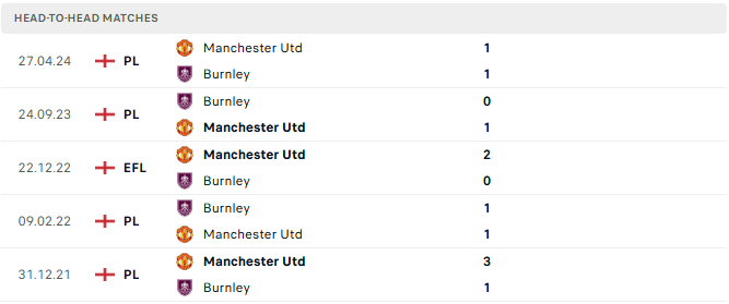 Dù vậy, thành tích đối đầu tại Old Trafford cho thấy Burnley gặp rất nhiều khó khăn. Trong 25 lần gần nhất hành quân tới đây, họ chỉ thắng đúng 1 trận (hòa 9, thua 15). Lần duy nhất đó là chiến thắng 2-0 hồi tháng 1/2020.