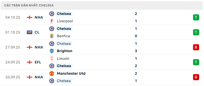Phong độ Chelsea 5 trận gần đây