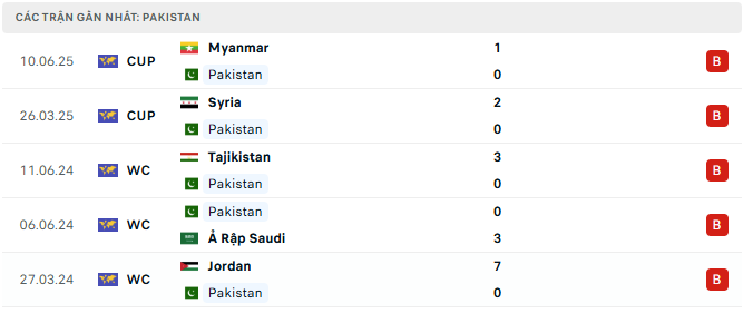 • Phong độ của đội tuyển Pakistan đang ở mức báo động khi họ đã để thua liên tiếp 8 trận trên mọi đấu trường và vẫn chưa có dấu hiệu khởi sắc. Hai lượt trận đầu tiên tại bảng E vòng loại Asian Cup 2027, Pakistan đều trắng tay trước Syria và Myanmar, đồng thời không ghi nổi bàn thắng nào. Hàng công yếu kém, trong khi hàng thủ thường xuyên mắc sai lầm cá nhân khiến đội bóng của HLV Nolberto Solano trở nên dễ bị tổn thương trước bất kỳ đối thủ nào.