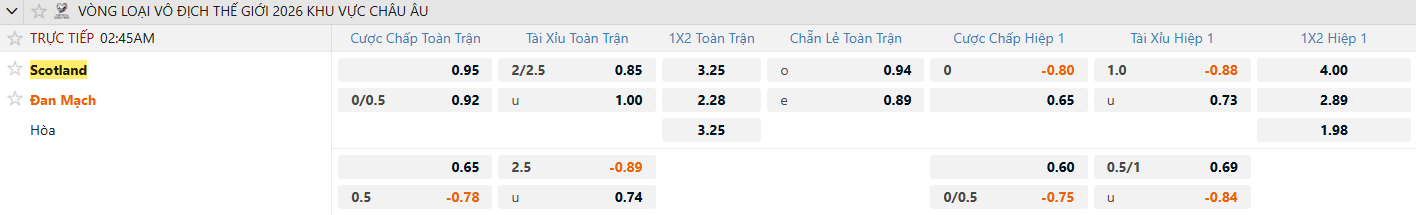 Với tính chất của một trận “chung kết” tranh vé đi World Cup, cả hai đội đều sẽ đặt sự thận trọng lên hàng đầu. Phong độ ghi bàn của Scotland và Đan Mạch không thực sự ấn tượng, trong khi hàng thủ của cả hai đều thi đấu khá ổn định. Lối chơi chắc chắn, ít mạo hiểm cùng lịch sử đối đầu thường khan hiếm bàn thắng khiến khả năng bùng nổ tỷ số là rất thấp. Với kèo tài xỉu 2.25, cửa Xỉu sáng hơn, dự đoán trận đấu có thể khép lại với tỷ số 1–0, 1–1 hoặc tối đa 2 bàn.