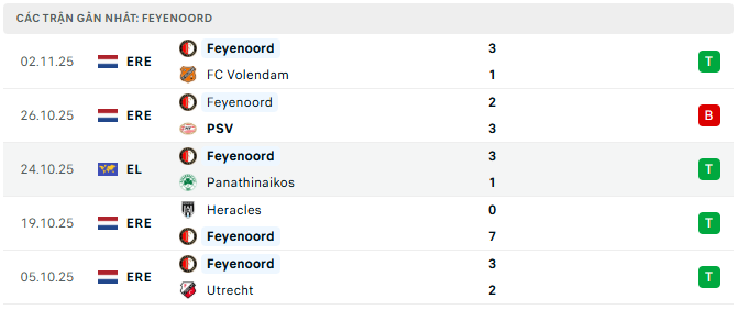 Feyenoord đang thể hiện phong độ cực kỳ ấn tượng ở cả đấu trường quốc nội lẫn châu Âu. Tại giải VĐQG Hà Lan, thầy trò HLV Arne Slot đang dẫn đầu bảng xếp hạng với 28 điểm sau 11 vòng đấu, giành 9 chiến thắng và thể hiện lối chơi tấn công áp đảo. Ở trận gần nhất, họ đánh bại FC Volendam với tỷ số 3-0, qua đó có chiến thắng thứ 4 trong 5 trận gần đây trên mọi đấu trường.