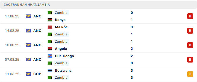 • Hàng thủ Zambia đang thực sự là nỗi lo lớn. Trong 7 trận gần nhất, họ để thủng lưới tới 15 bàn, trung bình hơn 2 bàn/trận. Riêng ở 3 trận thua gần nhất, Zambia đều nhận từ 2 bàn thua trở lên, cho thấy sự mong manh và thiếu gắn kết trong khâu phòng ngự.